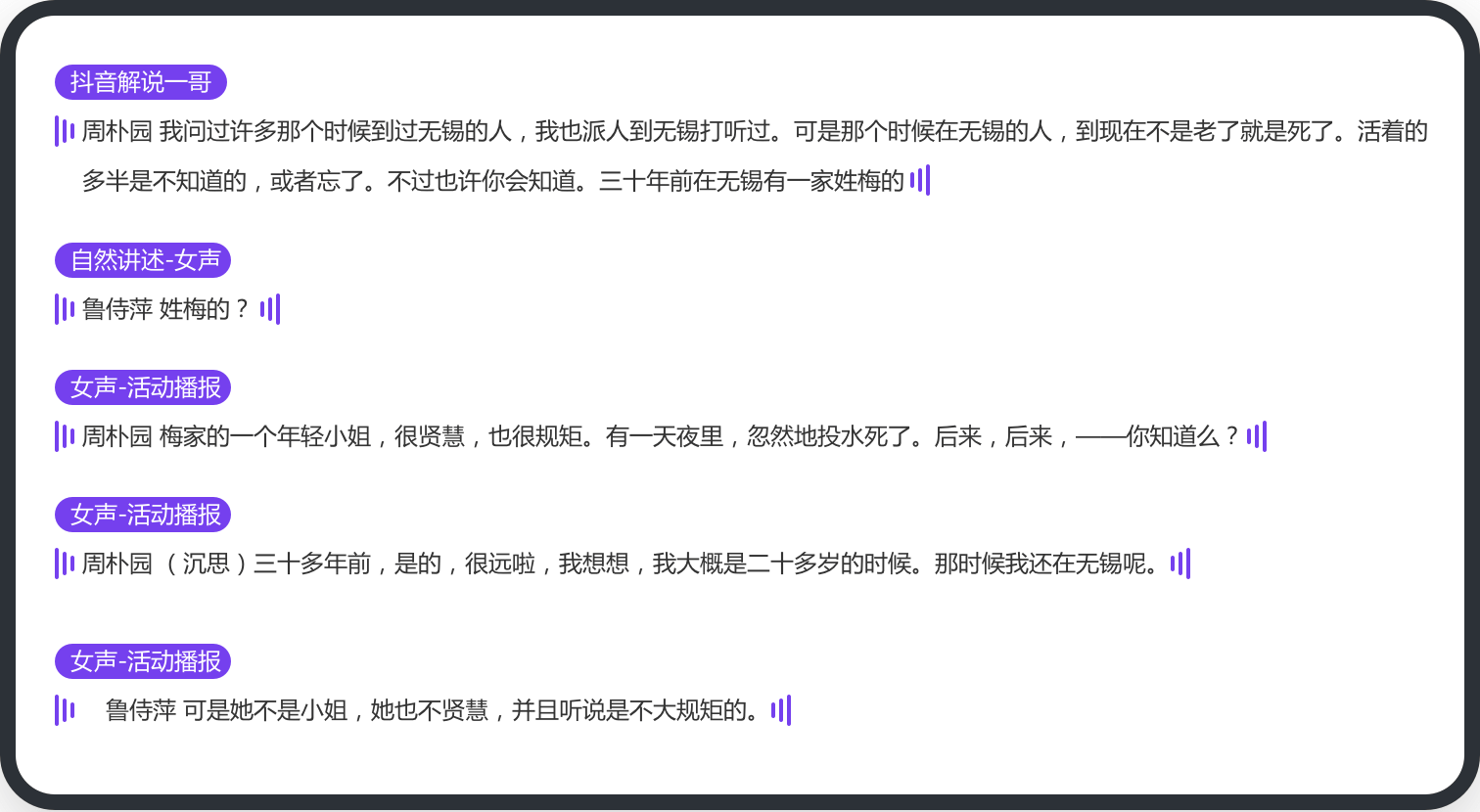 店里經(jīng)常會(huì)做一些促銷廣告需要配音,之前一直是找真人配音,配音時(shí)間長(zhǎng)價(jià)格也貴,經(jīng)銷商給我推薦的牛片配音,聲音真的超級(jí)真實(shí),完全聽不出來是機(jī)器合成,關(guān)鍵是機(jī)器不滿意還能選擇真人免費(fèi)試音。
